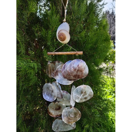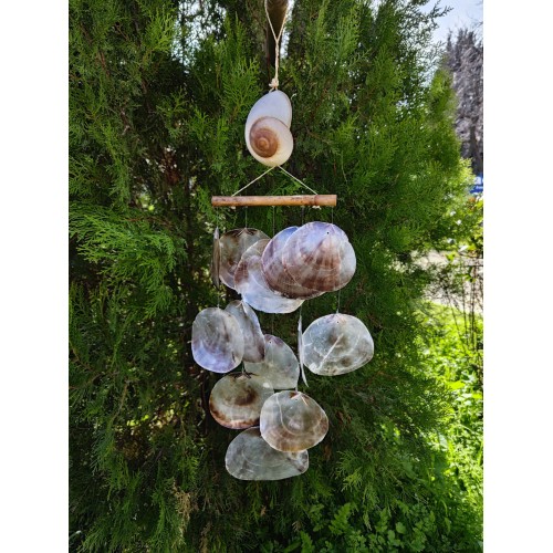 Doğadan gelen ses: deniz kabuklu rüzgâr çanı.Boyasız, tamamen kabukların kendi doğal renkleriyle; hafif esintide huzur, her tınıda deniz hissi.
