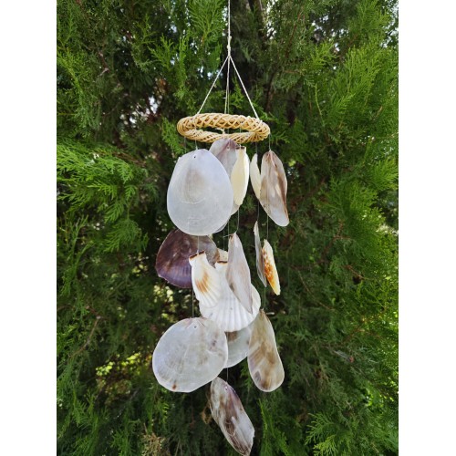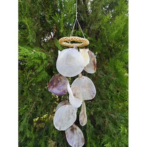 Doğadan gelen ses: deniz kabuklu rüzgâr çanı.Boyasız, tamamen kabukların kendi doğal renkleriyle; hafif esintide huzur, her tınıda deniz hissi.