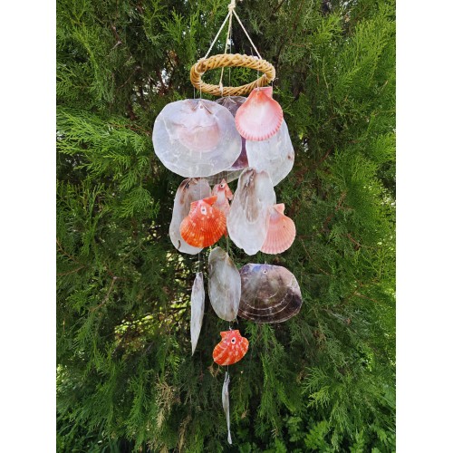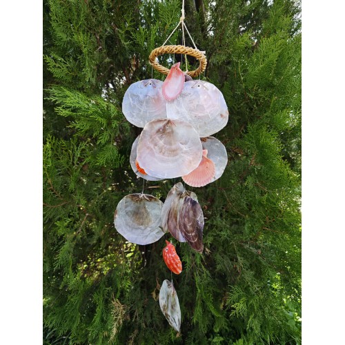 Doğadan gelen ses: deniz kabuklu rüzgâr çanı.Boyasız, tamamen kabukların kendi doğal renkleriyle; hafif esintide huzur, her tınıda deniz hissi.
