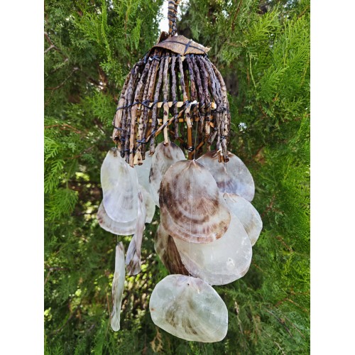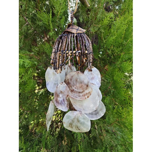 Doğadan gelen ses: deniz kabuklu rüzgâr çanı.Boyasız, tamamen kabukların kendi doğal renkleriyle; hafif esintide huzur, her tınıda deniz hissi.