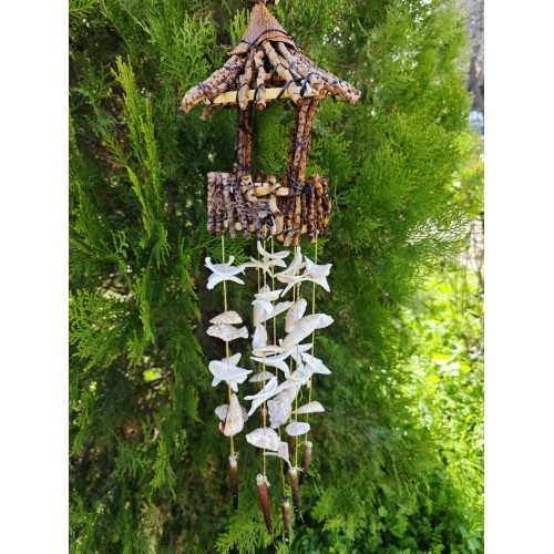 Doğadan gelen ses: deniz kabuklu rüzgâr çanı.Boyasız, tamamen kabukların kendi doğal renkleriyle; hafif esintide huzur, her tınıda deniz hissi.