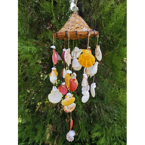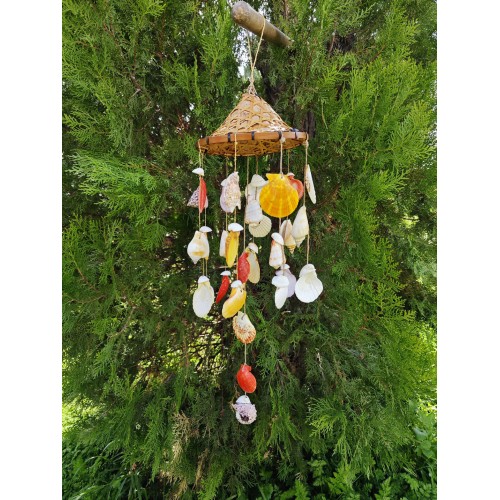 Doğadan gelen ses: deniz kabuklu rüzgâr çanı.Boyasız, tamamen kabukların kendi doğal renkleriyle; hafif esintide huzur, her tınıda deniz hissi.