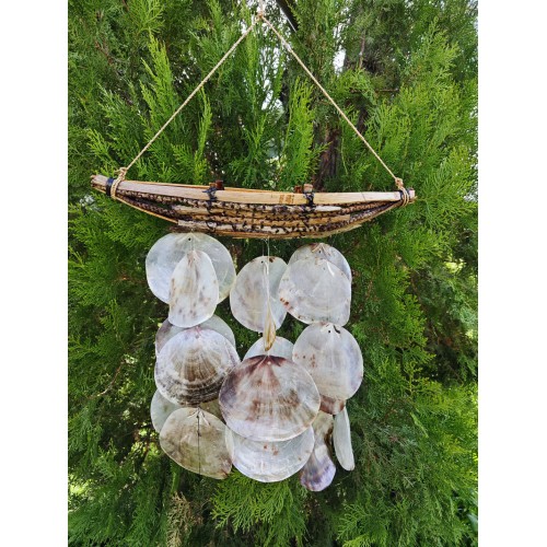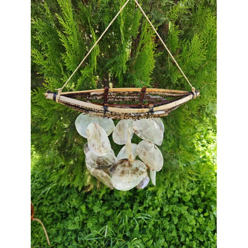Doğadan gelen ses: deniz kabuklu rüzgâr çanı.Boyasız, tamamen kabukların kendi doğal renkleriyle; hafif esintide huzur, her tınıda deniz hissi.