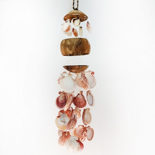 Hindistan cevizi 3 parçaya bölünerek doğal renkteki kabuklar eklenerek tasarlanmış deniz kabuğu sarkaç. Uzunluk : 55 cm