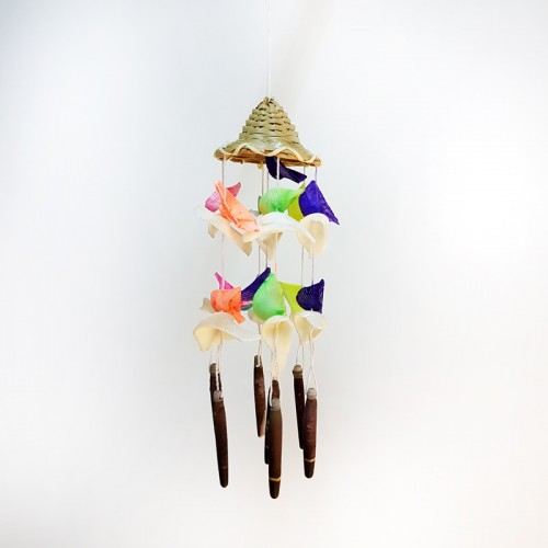 Dürme hasır şapka altına renklendirilmişkabuklar ile dekore edilmiş kabuk rüzgar çanı.Uzunluk:20 cm