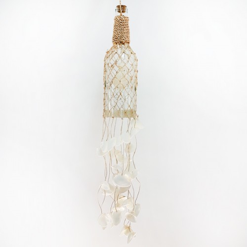 Cam şişeye doğal renkteki kabuklar eklenerek tasarlanmış deniz kabuğu sarkaç. Uzunluk : 58 cm
